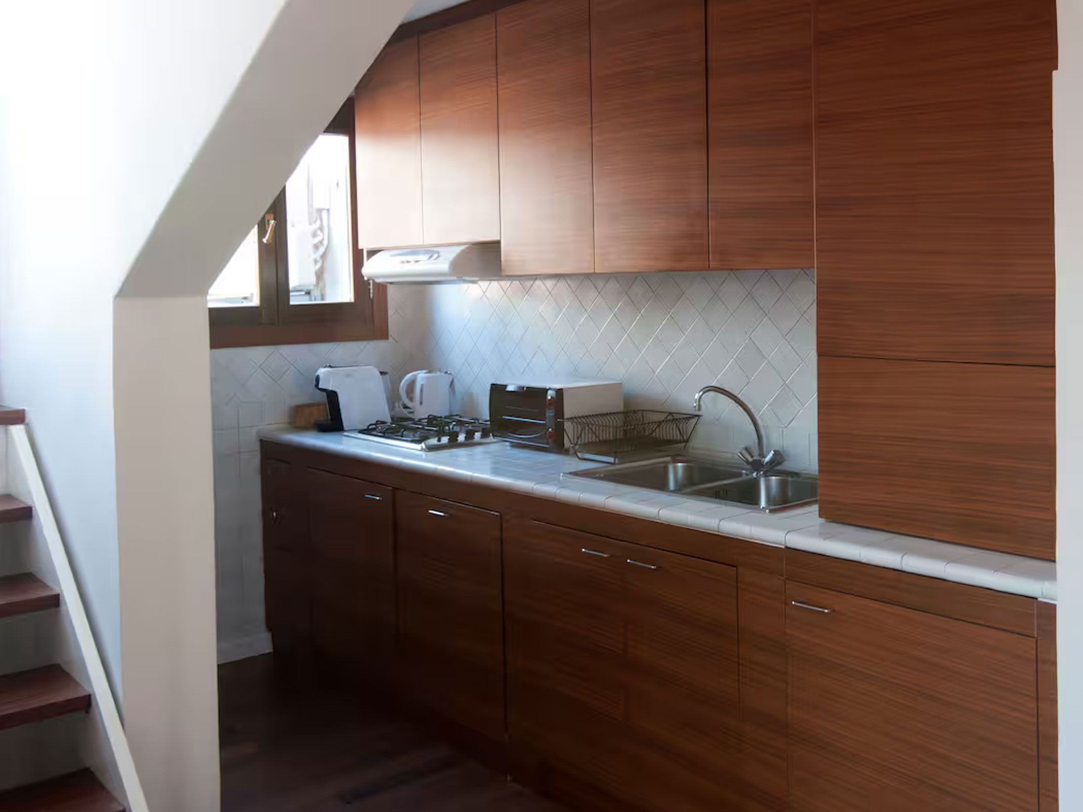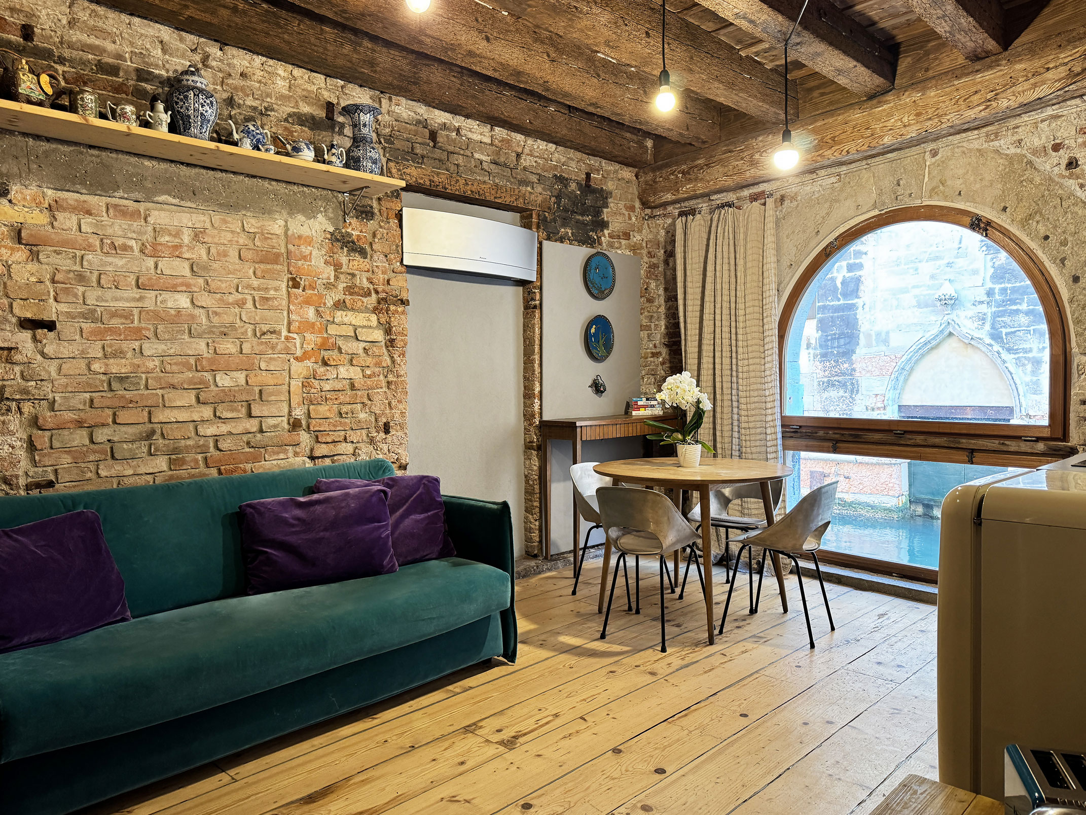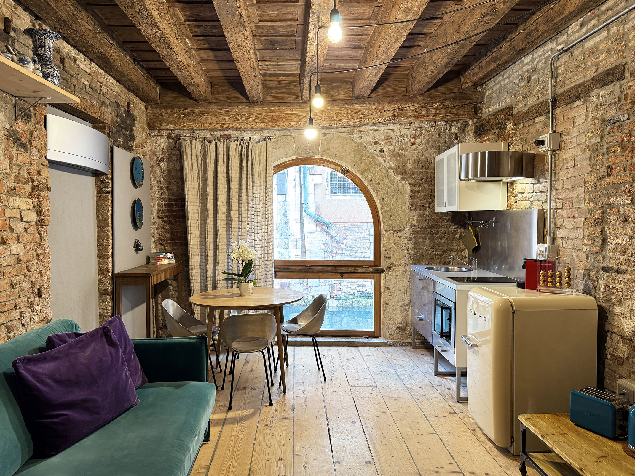 Situato al piano terra, questo appartamento unisce comfort e funzionalità. Dispone di una camera da letto accogliente, un angolo cottura completamente attrezzato con piano cottura, un bagno privato con doccia e set di cortesia. Le ampie finestre offrono una piacevole vista sul canale, creando un’atmosfera rilassante e autentica.
