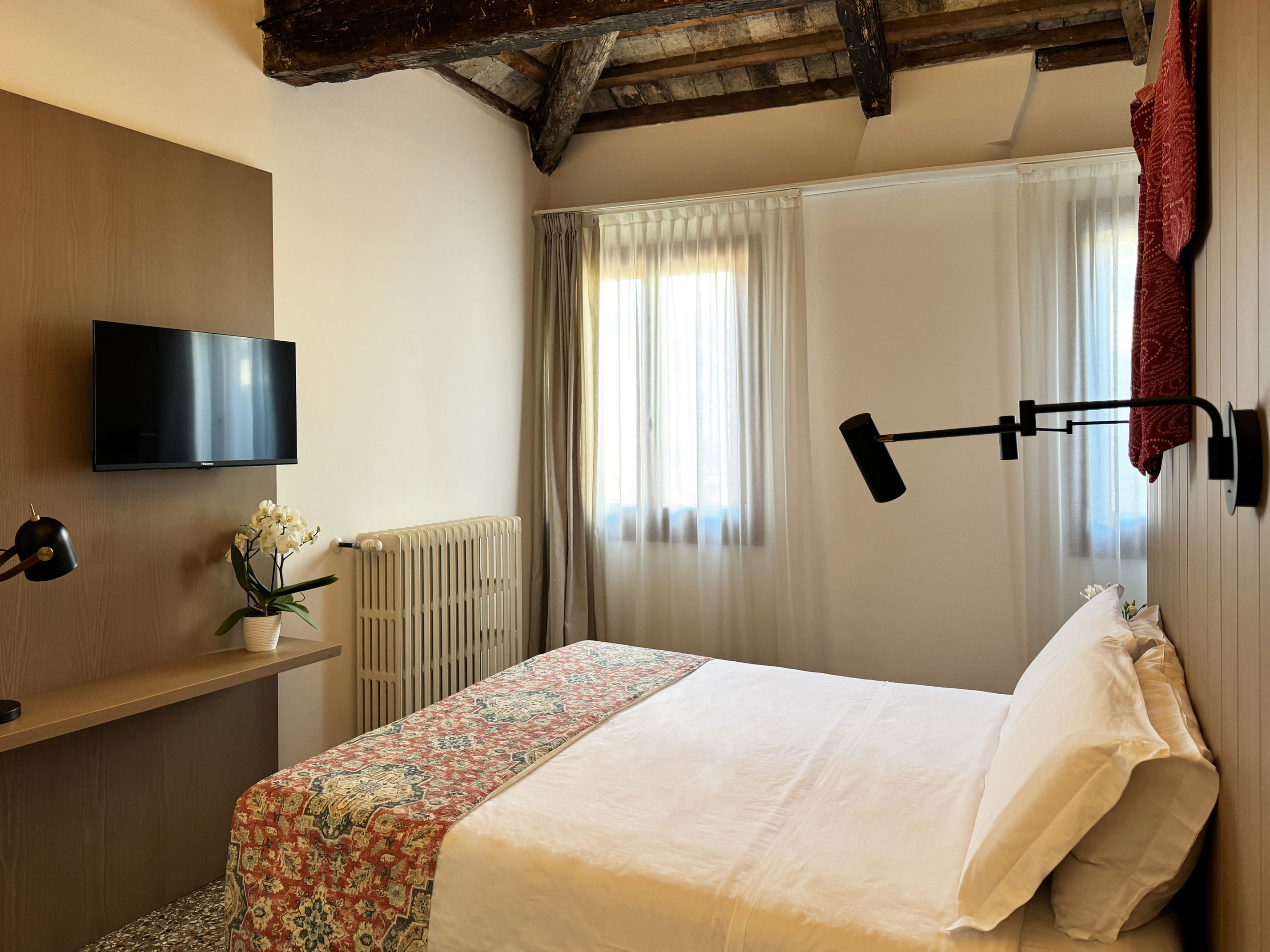 Camera confortevole con terrazza privata e vista sul cortile interno. Questa camera climatizzata e insonorizzata dispone di un comodo letto matrimoniale e di un bagno privato con vasca — l’ideale per un soggiorno rilassante nel cuore di Venezia.